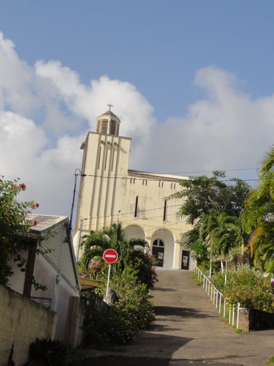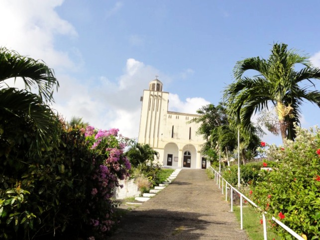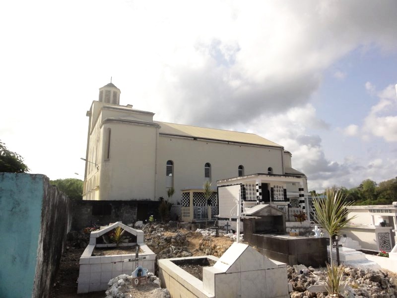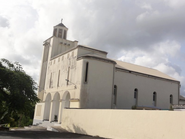 Construite en haut d'un morne dominant le petit port de Vieux-Bourg, l'église du village est un édifice religieux catholique auquel on accède par un chemin pentu, traversant un jardin aux espèces horticoles multiples, et menant à une succession de larges marches, aboutissant à son parvis.